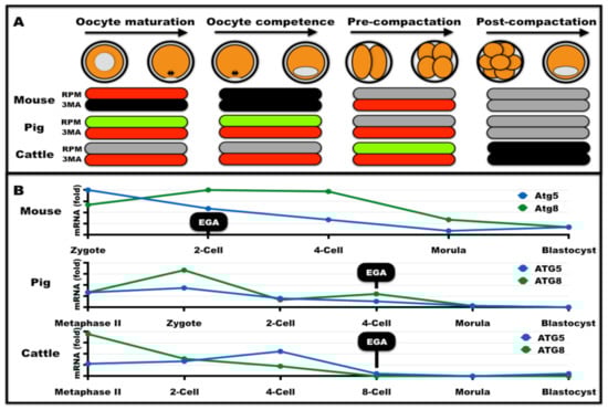 Autophagy modulation on mammalian oogenesis and preimplantation embryonic development. (A) In vitro incubation of oocytes/embryos with rapamycin (RPM; mTOR inhibitor/autophagy inducer) or 3-methyladenine (3MA; Type III PI3K inhibitor/autophagy inhibitor). Green bar: stage-specific improvement in oocyte maturation (progression from germinal vesicle to metaphase II stage), oocyte competence (ability of an oocyte to give rise to a blastocyst), and preimplantation embryonic developmental potential at the pre-compactation (zygote to 4-cell) and post-compactation (beyond 4-cell) stages (increase in cleavage and blastocyst yields, respectively). Red bar: stage-specific decrease in oocyte maturation, oocyte competence, or embryonic developmental potential. Gray Bar: no observable effect. Black bar: not determined. (B) Schematic representation of mRNA levels for the autophagy genes autophagy-related protein 5 (ATG5) and autophagy-related protein 8 (ATG8/LC3) during preimplantation embryonic development in selected mammalian species. Black boxes highlight the embryonic genome activation (EGA) for each species (the EGA in cattle occurs in the eight-to-sixteen cell stage transition).