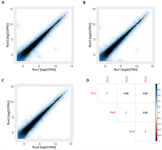 Figure 2. Correlation analysis comparing the three libraries. (A) Scatter plot of log2(CPM) values from run1 vs. run2. (B) Scatter plot of log2(CPM) values from run1 vs. run3. (C) Scatter plot of log2(CPM) values quantified from run2 vs. run3. (D) Correlation matrix with Pearson correlation coefficients.
