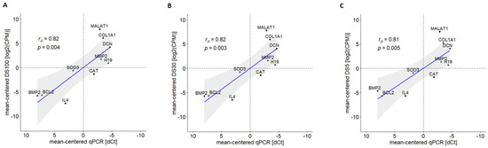Figure 3. Correlation analysis of gene expression levels obtained from qRT-PCR and ONT sequencing using (A) DS100, (B) DS30, and (C) DS5. Interleukin 4 (IL4), metastasis associated lung adenocarcinoma transcript 1 (MALAT1), collagen type I alpha 1 chain (COL1A1), decorin (DCN), matrix metallopeptidase 2 (MMP2), h19 imprinted maternally expressed transcript (H19), catalase (CAT), superoxide dismutase 3 (SOD3), BCL2 apoptosis regulator (BCL2), and bone morpho-genetic protein 2 (BMP2) genes were selected, and qPCR experiments were performed. Pearson correlation coefficients (rp) between log2(CPM) and dCt were computed and reported with the respective p-value (p).
