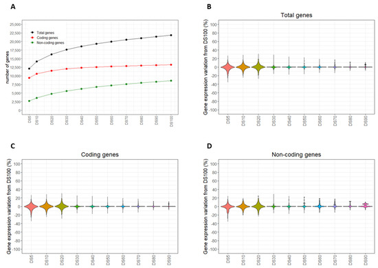 The gene quantifications obtained from each subset (from DS90 to DS5) were compared to the results of DS100 (as reference) to compute the gene expression variation (%GEV). A substantial reduction in the %GEV was shown considering the subsets larger than DS20 (Figure 4B and Supplementary Table S3). The %GEV values obtained for coding and non-coding genes had similar characteristics (Figure 4C,D; Supplementary Tables S4 and S5). However, in the latter, we observed a slightly higher %GEV.