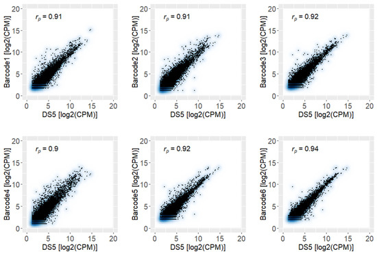 Furthermore, the expression levels of the barcoded samples were compared to the values quantified in the DS5 subset (Figure 6). The high correlation (rp ≥ 0.9 and p < 10−5) between each barcoded sample and the DS5 subset revealed the reproducibility and high quality of the obtained results.