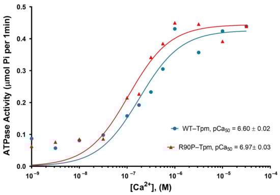 2.1. The R90P Mutation in Tpm3.12 Produces Abnormally High Myofilament Ca2+-Sensitivity in Protein Solution