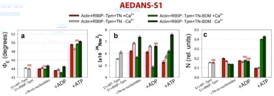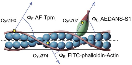 - Borovikov, Y.S.; Dedova, I.V.; dos Remedios, C.G.; Vikhoreva, N.N.; Vikhorev, P.G.; Avrova, S.V.; Hazlett, T.L.; Van Der Meer, B.W. Fluorescence depolarization of actin filaments in reconstructed myofibers: The effect of S1 or pPDM-S1 on movements of distinct areas of actin. Biophys. J. 2004, 86, 3020–3029. [Google Scholar] [CrossRef]