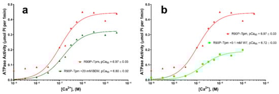 2.5. The Inhibitor of Myosin ATPase Activity, BDM, and the Ca2+-Desensitizer, W7, Are Able to Weaken the Ca2+-Sensitivity of Myofilaments Containing R90P-Tpm in Protein Solution
