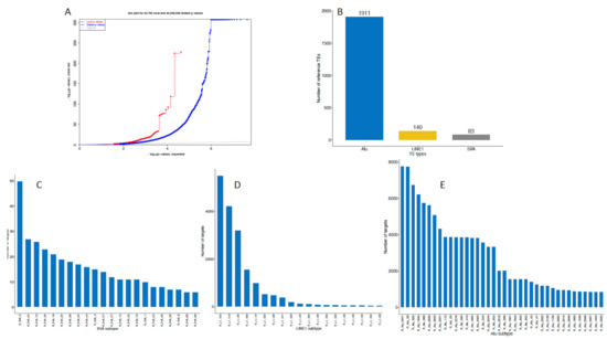Summary statistical information about the analysed transposable elements (TEs). (A) is a Q-Q plot of identified p-values from eQTL analysis; (B) is a plot for all TE categories we analysed in our study. (C–E) are separate density plots for the eQTLs (targets) for SVA, L1 and Alu repeats.