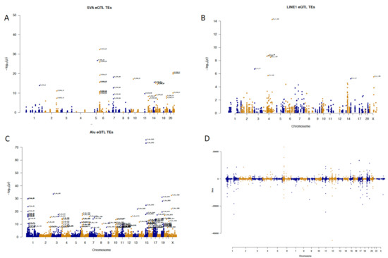 (A–C) Manhattan plots of SVA, L1 and Alu repeats illustrating the FDR values and locations of the target genes. (D) Manhattan plot showing effect sizes (beta values) of all TEs and the locations of their respective target genes/eQTLs.