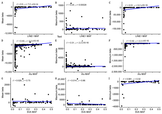 Correlation analysis between allele frequencies and beta values for L1, Alu and SVA. A, B and C show correlation between LINE1 MAF and its effect size and direction. D, E and F show correlation between Alu MAF and its effect size and direction. Panels G, H and I show correlation between SVA MAF and its effect size and direction. Mean beta is an average effect size for a specific TE, maximum beta shows activating effects for specific TE and minimum beta indicates suppressive regulatory effect. The effect of LINE1 and Alu elements had clear MAF dependent correlation. SVA effect did not correlate with MAF.