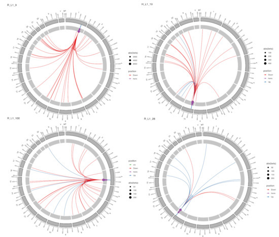 L1 elements contribute to 17% of the human genome and are the only autonomous TE [12]. Out of all studied L1 elements, 107 demonstrated statistically significant eQTL effects. Of these, only 13 of them had a single target locus; 51 had 2–10 loci, and 43 L1 elements had more than 10 loci with quantitative regulatory effect. For example, L1-134 had 5497 loci under its control; L1-115 had 4231 quantitative loci (Supplementary Table S3). The regulatory effect direction was quite diverse. Some effects of L1 are illustrated in Figure 5, in which L1-9 on chromosome 1 had 37 targets all repressed in trans with very large beta values. L1-19 on chromosome 10 had 27 targets in trans position with four enhancing effects. L1-100 on chromosome 4 had 32 targets, one in cis position and five targets under activating influence. L1-28 in chromosome 11 had 12 targets with mostly up-regulating effects, all trans and three down-regulating influence (Figure 5).