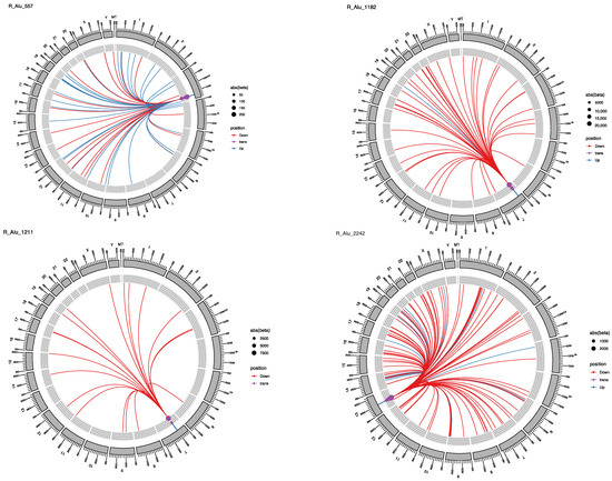 Circos plots showing the targets and effects for four different Alus. Blue line is for up-regulation; red line is for down-regulation of the gene. Dot size is beta value; dot colour is trans or cis effect.