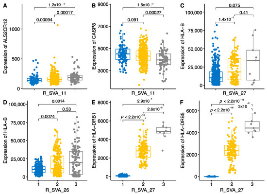 Boxplot of six different genes influenced by SVAs. Genotypes of SVAs are shown as number 1 for AA, 2 for PA and 3 for PP. Numbers and lines above the bar show p-values of the pairwise comparison. p-values are from the Wilcoxon pairwise comparison. Panels A–F indicate six genes and their expression dependence on the SVA genotype, Panel B shows dose-dependent downregulating effect of SVA-11.