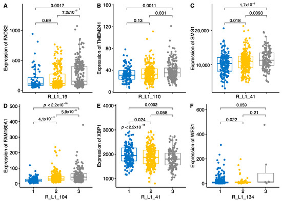 Like the SVAs, L1s had clear copy-number-dependent effect on their target genes (Figure 8). For instance, the presence of L1-19 significantly up-regulated the FADS2 gene (Figure 8A), one of the many targets for this L1 (Figure 5). L1-110 and L1-104 are other examples wherein the presence of the L1 element induces gene expression in an additive manner. L1-41 had gene expression activating and suppressing effects, depending on the target. The SMG1 gene in cis position was significantly upregulated by the presence of the L1-41, whereas the XBP1 gene in trans position was significantly down-regulated by the presence of L1-41 (Figure 8C,E). The XBP1 gene is involved in the ER stress response and acts as a transcription factor to initiate the unfolded protein response (UPR). As XBP1 has functional interaction with another ER-stress-related gene, WFS1, we also tested if WFS1 gene is activated by any of the TEs or L1 elements [18]. We identified 14 TEs that regulate the expression of WFS1, three L1 and 11 Alu repeats regulating its expression, and only one L1, L1-134, had an activating effect that was dependent on the copy number of the L1-134 element (Figure 8F).