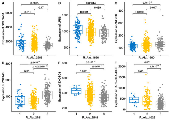 Boxplot of six different genes influenced by Alu repeats. Genotypes of Alus are shown as number 1 for AA, 2 for PA and 3 for PP. Numbers and lines above the bar show p-values of the pairwise comparison. p-values are from the Wilcoxon pairwise comparison. Panels A–F show variable regulation of genes by Alu elements. A, B, E and F show dose-dependent downregulating effect.