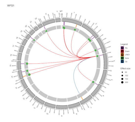 Circos plot of the TEs regulating the WFS1 gene. Alu and L1 are indicated as purple or yellow bars respectively. Green dots indicate trans-regulating effects. Dot size illustrates beta value. Colour of the line indicates up-regulation (blue) or down-regulation (red).