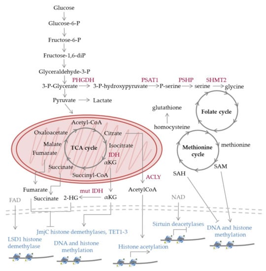 Schematic representation of selected metabolic pathways and enzymes discussed in the text. The reactions occur in normal cells; however, mutations (e.g., in IDH (mut IDH)) or aberrant regulation observed in malignant cells can lead to shift towards specific pathways versus others and altered levels of metabolites compared to normal cells, which has an impact on epigenetic processes. Nucleosomes are depicted at the lower part of the figure; epigenetic modifications can lead to gene activation (arrows), repression (flat-ended lines), while in many cases their effect varies depending on the genomic location, cell type, and other factors. 2-HG: 2-hydroxyglutarate, α-KG: α-ketoglutarate, acetyl-CoA: acetyl coenzyme A, FAD: flavin adenine dinucleotide, IDH: isocitrate dehydrogenase, LSD1: lysine specific demethylase 1, NAD: nicotinamide adenine dinucleotide, PHGDH: phosphoglycerate dehydrogenase, PSAT1: phosphoserine aminotransferase 1, PSHP: phosphoserine phosphatase, SAH: S-adenosylhomocysteine, SAM: S-adenosylmethionine, SHMT2: serine hydroxymethyltransferase-2, TET1-3: ten-eleven-translocation 1-3.