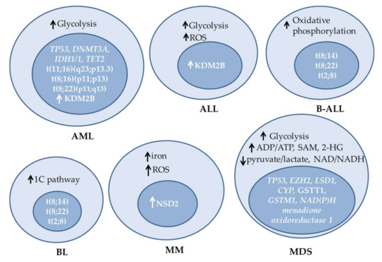 In comparison to solid tumors, in hematologic malignancies neoplastic cells are generally more easily accessible, and can often be isolated from the patient’s peripheral blood. This has provided basic research with a valuable resource, which has allowed for deeper understanding of the underlying biology and has established the basis of development of effective treatments. Genetic analysis has identified a growing list of chromosomal abnormalities and point mutations that are recurrent in various types of blood neoplasms. Some of them are considered driver mutations, as they are critically involved in the neoplastic transformation [2], while others accumulate in the process, as they provide selective advantage to the rapidly proliferating tumor cell. In addition to genetic alterations, epigenetic changes, i.e., modifications of chromatin which do not affect the DNA sequence, are also key components of the initiation and evolution of hematologic malignancies, primarily via their effect on regulating the expression of numerous genes implicated in cellular processes such as proliferation and differentiation [3]. Both genetic and epigenetic events also contribute to the metabolic rewiring of the cancer cell, which supports its increased energetic and biosynthetic demands in a dynamic microenvironment. Interestingly, signaling between the nucleus and metabolism is bidirectional, as metabolites also regulate epigenetic modifications via direct and indirect mechanisms.