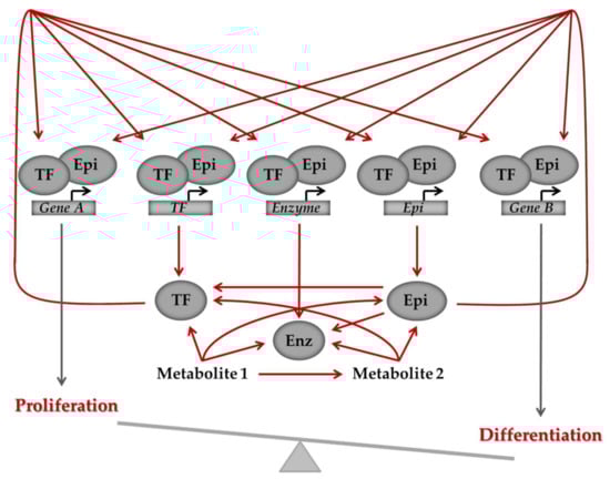 General model of the intricate interrelationships between the genome, metabolism and the epigenome. Defective regulation of the pathways can shift the balance between differentiation and proliferation and ultimately cause a transition from normal to malignant state. Arrows depict regulation, which can be activation or inhibition. Cross-talk between genes and metabolites is bi-directional, as illustrated by the arrows, with genes regulating metabolites, which, in turn, via their effect on epigenetic modifiers and transcription factors, signal back to the epigenome and regulate gene expression. Enz: metabolic enzyme, Epi: epigenetic regulator, TF: transcription factor.