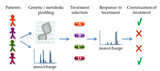 Potential application of genetic and metabolic profiling for treatment decision and response assessment. Patient samples can be subject to genetic sequencing to identify specific mutations as well as metabolomics analysis, e.g., by mass spectrometry, to profile metabolites (based on their mass/charge ratio schematically depicted). The results can guide the selection of the optimal treatment for the patient. Subsequently, metabolic analysis can also be used to assess response to therapy (illustrated as a shift in peaks in the spectrum) and determine continuation of the specific treatment or switch to a different approach.
