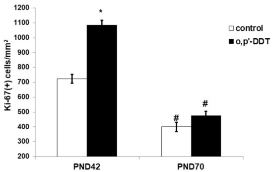 Proliferative activity of the glomerulosa cells in the control and o,p-DDT exposed rats. Data are shown as mean ± S.E.M. PND, day of postnatal development; p < 0.05 compared to the control (*), compared to PND42 (#).