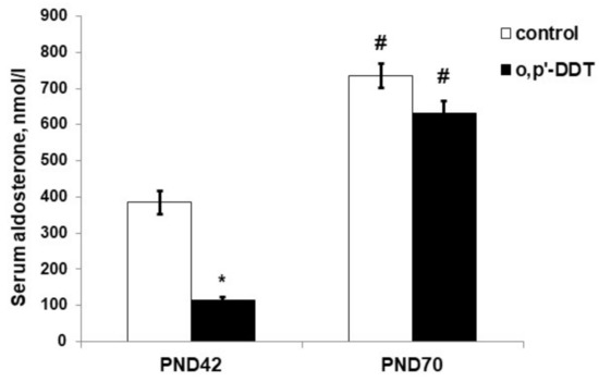 Aldosterone serum concentration in the control and o,p-DDT exposed rats. Data are shown as mean ± S.E.M. PND, day of postnatal development; p < 0.05 compared to the control (*), compared to PND42 (#).