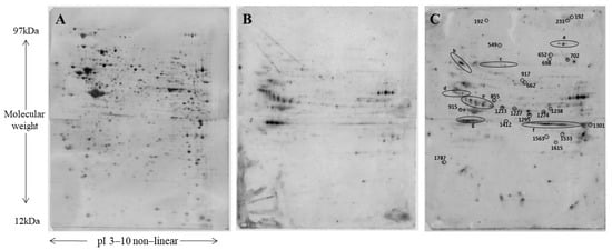 2-DE coupled with WB was employed to detect specific phosphorylated proteins. Proteins from C2C12 cells were firstly separated according to pI on Immobiline Dry-Strips (18 cm, non-linear gradient pH 3–10) and then according to molecular weight using 11% polyacrylamide gels. Subsequently, proteins were transferred onto nitrocellulose membranes. Immediately after WB, membranes were stained with RuBP. Thereafter, membranes were incubated with the anti-phosphothreonine antibody. (A) A representative nitrocellulose image with a 2-DE protein map of C2C12 cells (control). Proteins were detected by RuBP staining. (B) The same membrane with detection of the immunoreactive spots. (C) A representative nitrocellulose membrane with detection of the immunoreactive spots of C2C12 cells treated with FA5. Spots differentially phosphorylated are highlighted.