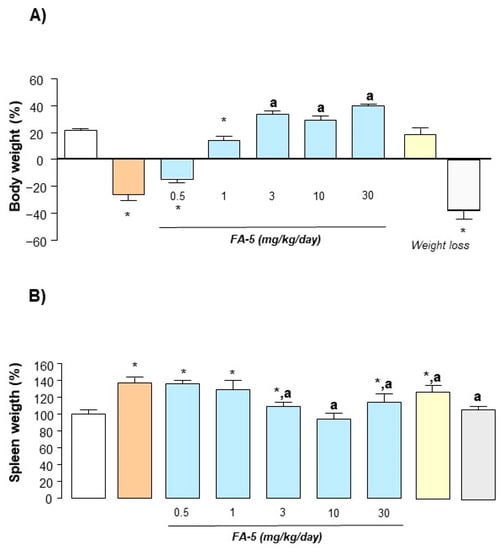 Body (A) and spleen weight (B) estimated in rats with DNBS-induced colitis treated with FA5 (0.5, 1, 3, 10, 30 mg/kg/day) acadesine (10 mg/kg/day) or dexamethasone (0.1 mg/kg/day). Each column represents the mean ± standard error of the mean (SEM) (n = 8). *, p < 0.05, significant difference versus control group; a, p < 0.05, significant difference versus DNBS group.