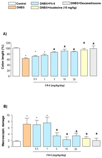 Colonic length (A) and macroscopic damage score (B) evaluated in rats with colitis, either in the absence or in the presence of FA5 (0.5, 1, 3, 10, 30 mg/kg/day), acadesine (10 mg/kg/day), or dexamethasone (0.1 mg/kg/day). Each column represents the mean ± standard error of the mean (SEM) (n = 8). *, p < 0.05, significant difference versus control group; a, p < 0.05, significant difference versus DNBS group.