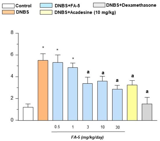 Microscopic damage score estimated for colon in rats under normal conditions or with DNBS-induced colitis, either alone or after treatment with FA5 (0.5–30 mg/kg/day), acadesine (mg/kg/day), or dexamethasone (1 mg/kg). Each column represents the mean ± standard error of the mean (SEM) (n = 8). * p < 0.05, significant difference vs. control group; a p < 0.05, significant difference vs. DNBS group.