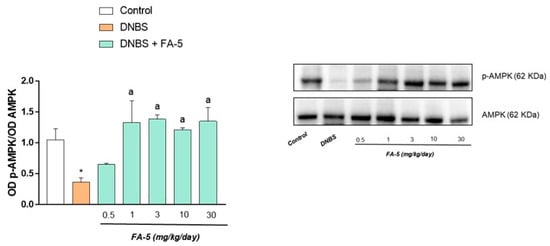 Representative blots and densitometric analysis of the expression of phospho-AMPK and AMPK in colonic tissues from control rats and animals treated with DNBS alone or in combination with FA-5 (0.5, 1, 3, 10, 30 mg/kg/day). Each column represents the mean ± standard error of the mean (SEM) (n = 6). One-way ANOVA followed by Tukey’s post hoc test results: * p < 0.05, significant difference vs. the control group; a p < 0.05, significant difference vs. the DNBS group.