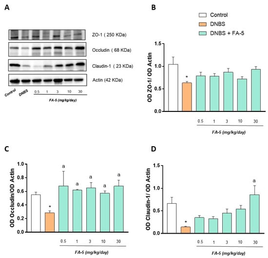 Representative blots (A) and densitometric analysis of the expression of ZO-1 (B), occludin (C), and claudin-1 (D) in colonic tissues from control rats and animals treated with DNBS alone or in combination with FA-5 (0.5, 1, 3, 10, 30 mg/kg/day). Each column represents the mean ± standard error of the mean (SEM) (n = 6). One-way ANOVA followed by Tukey’s post hoc test results: * p < 0.05, significant difference vs. the control group; a p < 0.05, significant difference vs. the DNBS group.