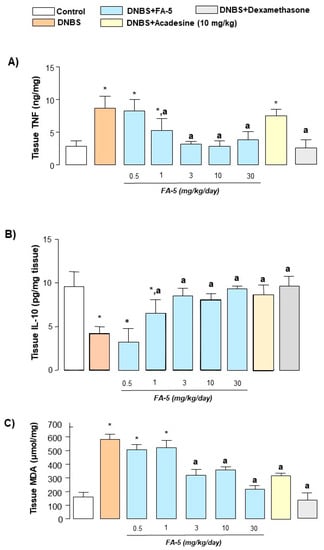 TNF (A), IL-10 (B), and MDA (C) levels in colonic tissues from control rats or in animals treated with DNBS either alone or in combination with FA5 (0.5, 1, 3, 10, 30 mg/kg/day), acadesine (10 mg/kg/day), or dexamethasone (0.1 mg/kg/day). Each column represents the mean ± standard error of the mean (SEM) (n = 8). *, p < 0.05, significant difference versus control group; a, p < 0.05, significant difference versus DNBS group.