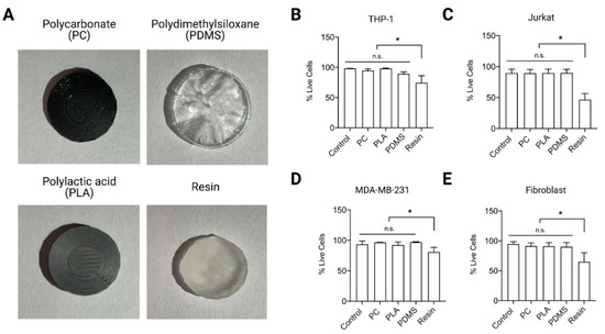 Materials for biocompatibility tests were fabricated as a 13 mm disk. From polycarbonate (PC; Filatech 3D Printing Industries FZC, Ras Al-Khaimah, UAE) and polylactic acid (PLA; Prusa Research a.s., Prague, Czech Republic), both filaments were printed using a Prusa i3 MK3 printer (Prusa Research a.s., Prague, Czech Republic). Resin (Dental LT Clear Resin; Formlabs, Somerville, MA, USA) was fabricated using a Form 2 3D printer (Formlabs, Somerville, MA, USA). Polydimethylsiloxane (PDMS, Dow Inc., Midland, MI, USA) disks were fabricated by mixing the elastomer base and curing agent at 10:1 ratio (SYLGARD 184, Dow Inc., Midland, MI, USA). Materials were rigorously cleaned by washing with 70% ethanol and distilled water, followed by UV sterilization prior to use.