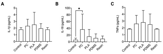 Pro-inflammatory cytokine levels. Figure shows the levels of (A) IL-1β, (B) IL-18 and (C) TNFα released from THP-1 cells incubated for 24 h with PC, PLA, PDMS and resin. Data are presented as mean ± SD. Experiments were performed in at least 8 replicates. * indicates a p value ≤ 0.05.