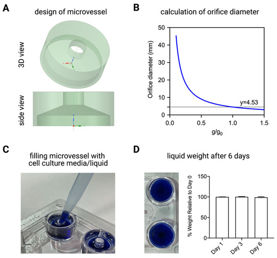 Microvessel design. (A) Design of microvessel seen from the top and side view. (B) Calculation of the orifice diameter to ensure surface tension force prevents loss of liquid or culture media from 4-well plate at different gravity levels, since the microvessels can be used on reduced gravity platforms that may also momentarily experience hypergravity. (C) Visual representation of the ease of filling the microvessel with culture media or liquid. (D) Visual representation of full microvessels with no air bubbles and graph depicting the percent of weight in the vessel after 6 days relative to day 0. Data are presented as mean ± SD. Experiments were performed in at least 3 replicates.