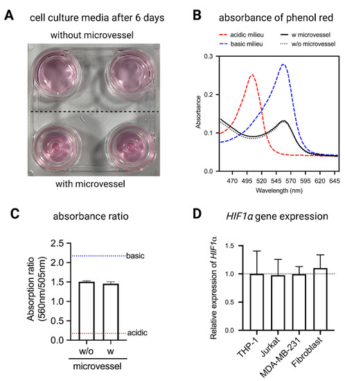 Gas exchange adequacy of microvessels. (A) Representative image of cell culture media after 6 days of culture with and without microvessels. (B) Absorbance of phenol red in cell culture media and (C) absorbance ratio (560 nm/505 nm) of phenol red in cell culture media. (D) Expression of HIF1α levels in THP-1, Jurkat, MDA-MB-231 and Fibroblast cells cultured with PDMS microvessels relative to control samples cultured without microvessels. Data are presented as mean ± SD. Experiments were performed in at least 4 replicates.