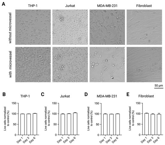 Long-term effects of microvessel on cell culture. (A) Images of cells cultured with and without microvessels for 6 days. Long-term viability of (B) THP-1, (C) Jurkat, (D) MDA-MB-231 and (E) Fibroblast cells cultured with microvessels for 1 day, 3 days and 6 days. Data are presented as mean ± SD. Experiments were performed in at least 4 replicates.