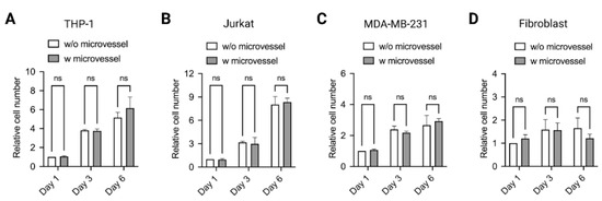 Cell proliferation within microvessel. Proliferation of (A) THP-1, (B) Jurkat, (C) MDA-MB-231 and (D) Fibroblast cells cultured for 6 days with and without microvessels. Data are presented as mean ± SD. Experiments were performed in at least 3 replicates. n.s. indicates non significant.