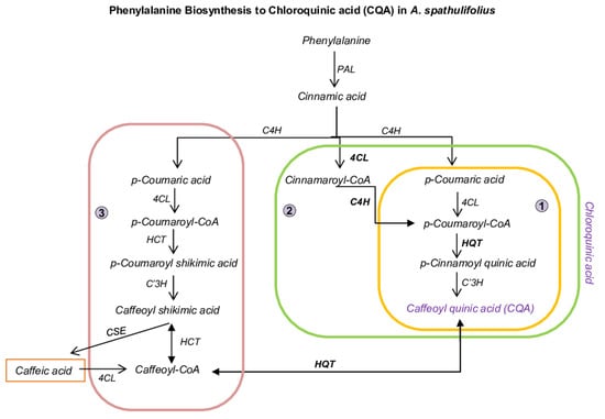 Schematic diagram of phenylalanine towards to caffeoylquinic acid (CQA) biosynthesis in A. spathulifolius. 1, 2, and 3 indicate the different route pathways of chlorogenic acid production. PAL, phenylalanine ammonia-lyase; C4H, cinnamic acid 4-hydroxylase; 4CL, 4-coumarate--CoA ligase; C3′H, p-coumarate 3′Hydroxylases; CSE, caffeoylshikimate esterase. HCT, hydroxycinnamoyl CoA shikimate hydroxycinnamoyl-transferase; HQT, hydroxycinnamoyl CoA quinate hydroxycinnamoyl-transferase.