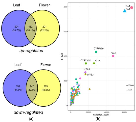 (a) A Venn diagram shows up and downregulation of PPP in A. spathulifolius leaf and flower. (b) The geom point plot shows the upregulated differential expressed genes of PPP in leaf and flower of A. spathulifolius.