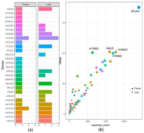 (a) Distribution of ’HXXXD’ domain among the leaf and flower of A. spathulifolius. The blank space indicates absence of domain; (b) The DEGs expression of up and downregulated BAHDs unigenes among the different transcripts.