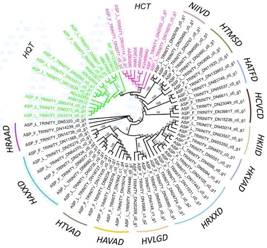 The unrooted phylogenetic trees were constructed from a complete ORF and with the presence of the binding site, the ‘HXXXD’ and ‘DFGWG’-conserved domain of the BAHD family members. The HTLAD and HTLSD domains of unigenes were grouped into the previously reported HQT genes. The HHAAD domain of A. spathulifolius leaf and flower was grouped into the HCT unigenes previously reported in other known Asteraceae. Interestingly, the domains of HYVVD and HVVAD also clade within the HQT unigenes domains of HTLAD and HTLSD, which are highly diverged in the domain sequence (Figure 4, Figure S2). In contrast, the domain of NIIVD showed the lowest number of duplications in comparison to other distributed BAHDs. The HKXXD-distributed genes were grouped into one clade, showing that the HKIID and HKVAD are highly diverged duplicated BAHDs family proteins with seven copies, even though HKIAD was grouped into another clade after the HRTSD domain. In contrast, most of the HAXXD-based domains were grouped into a single clade with seven duplicated unigenes. Among them, the HRAAD domains showed the least diverged group of genes in A. spathulifolius: two copies in the flower and one in the leaf. Although the HTMSD expressed highly in both the leaf and flower, it was missing the single amino acids of ‘HTXSD’ (looks similar to the HQT domain), but it forms a separate clade after the NIIVD domain (Figure 4). Based on the phylogenetic tree, the putative HXXXD domain highly diverged and duplicated in both the leaf and flower of A. spathulifolius were identified.