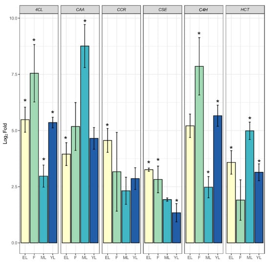 Comparative quantification of PPP unigenes in different plant parts of A. spathulifolius. The error bar indicates the mean of ± SD, and * indicates qRT-PCR changes that are statistically significant by t-test (p ≤ 0.05). 4CL; 4-coumarate--CoA ligase, CAA; coumaroyl-CoA, CCR; cinnamoyl-CoA reductase, CSE; caffeoylshikimate esterase; C4H, cinnamic acid 4-hydroxylase; HCT, hydroxycinnamoyl CoA shikimate hydroxycinnamoyl-transferase.