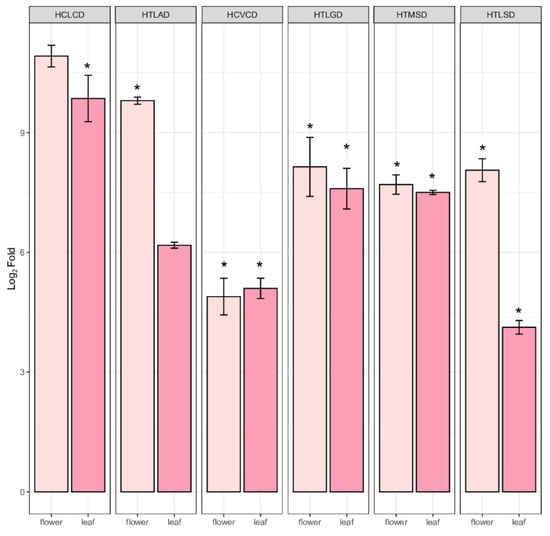 Overlay of quantified expression of HXXXD—hydroxycinnamoyl acyltransferase unigenes in flower and leaf of A. spathulifolius. The error bar indicates the mean ± SD, and * indicates qRT-PCR changes that are statistically significant by t-test (p ≤ 0.05). Note: HTLAD and HTLSD belong to HQT class domain.