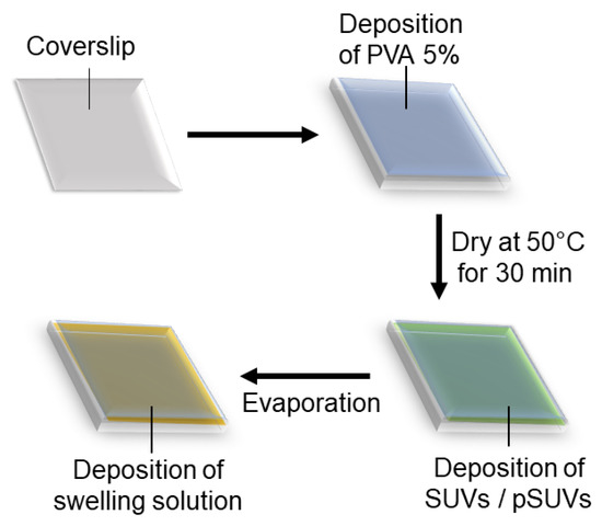 Schematic representation of the protocol for PVA-assisted swelling of GUVs incorporating integrins. A glass coverslip is coated with an aqueous solution of PVA which is dried, then coated with a solution of previously prepared SUVs which is again dried. In the last step, the swelling buffer is deposited. The PVA as well as the dried lipid–protein mixture are hydrated, and GUVs are formed.