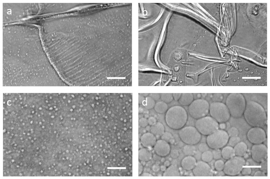 PVA-assisted swelling. Examples of folds (a) and cracks (b) of the PVA layer, leading to no swelling (if folds) or low-yield swelling (if too many cracks). Images of GUVs during PVA-assisted swelling at t = 2 min (c) and t = 15 min (d). Scale bars: 10 m.