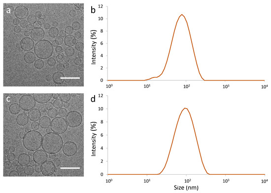 Characterisation of pure lipid SUVs (a,b) and integrin-containing pSUVs (c,d) by Cryo-Electron Microscopy (Cryo-TEM) ((a,c), scale bars: 100 nm) and Dynamic Light Scattering (DLS) (b,d). At this resolution, the transmembrane protein is not visible in TEM.