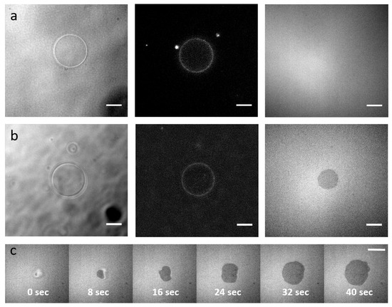 In addition to the PVA-assisted swelling method, GUVs (or pGUVs) were also prepared using the electro-swelling technique [23,51,60]. Lipids dissolved in chloroform (or pSUVs in aqueous solution) were deposited onto indium-tin-oxide (ITO)-coated electrodes. After evaporating the solvent (same protocol as gel-assisted swelling), a home-made swelling chamber was filled with a 200 mM sucrose solution, and the content was exposed to an AC electric field of 1.7 V at 10 Hz for 3 h. The GUVs (or pGUVs) were harvested and observed as for those prepared by gel-assisted swelling.