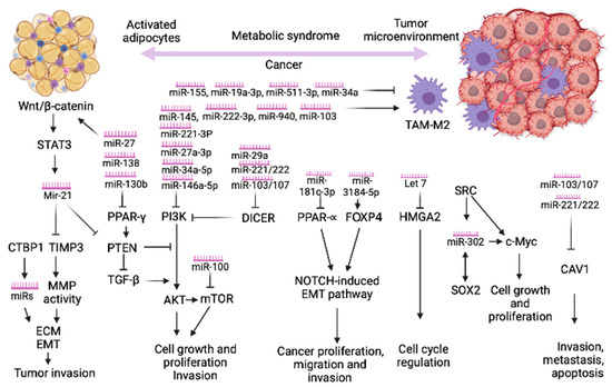 Signaling pathways and the corresponding miRs implicated in MetS- associated cancer. Several miRs are deregulated in both MetS/obesity and various types of cancers. Mir-21 is regulated by B-catenin via STAT3 and plays a role in oncogenesis and cancer progression through its direct targets TIMP3, which modulates matrix MMP activity and the PTEN/PI3K/AKT signaling pathway. PI3K/AKT represents the prevalent pathway implicated in carcinogenesis and MetS/obesity. The Mir221/222 cluster is implicated in both IR and cancer via CAV1, a key regulator for cell proliferation, apoptosis, migration, and metastasis. Other pathways implicated in cancer initiation and progression are: NOTCH-induced EMT, HMGA2, SOX2, c-Myc. TAM—tumor associated macrophages, MMP—matrix metalloproteinases, EMT—epithelial–mesenchymal transition, ECM–extracellular matrix, STAT3—signal transducer and activator of transcription 3, TIMP3—tissue inhibitor of metalloproteinase 3, PPAR-γ—peroxisome proliferator-activated receptor gamma, PTEN–phosphatase and tensin homolog, PI3K—phosphoinositide 3-kinase, AKT—protein kinase B, mTor—mammalian target of rapamycin, PPAR-α—Peroxisome proliferator activated receptor alpha, HMGA2—high mobility group AT-hook 2, SRC—Proto-oncogene tyrosine-protein kinase Src, SOX2—SRY-Box transcription factor 2, c-Myc—Cellular myelocytomatosis oncogene, CAV1—Caveolin 1.