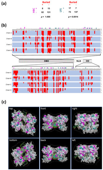 Variant LFS- and HBC-residues are distributed and juxtaposed throughout the DBD located in the central part of TP53 with no apparent pattern associated with either disease outcome. We considered whether there might be associations with secondary-structure elements (alpha-helix, beta-sheet or disordered regions), tertiary structure aspects (such as Surface or Buried locations) or quaternary structure aspects (DNA interacting residues or inter-monomer protein interacting residues in the context of the TP53 tetramer). For each of the TP53 monomers (Chain A, B, C and D), there was a significant enrichment of variant LFS-residues in the approximately 30% of residues that are Buried (i.e., least Surface exposed) in the crystal structure of the wild-type TP53 tetramer bound to DNA (Table S2). A similar result was also obtained when the Buried (non-Surface) classification of residues was combined for all four monomers (Figure 2a). No other significant associations were found (Table S2).