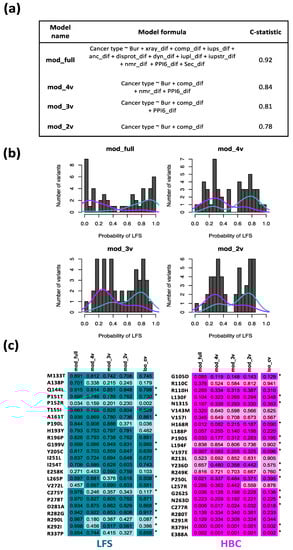 Figure 3b shows the binomial distribution of prediction probabilities for the models with all showing a minima close to a probability of 0.5. The figure also shows the relative distribution of the known disease outcomes in relation to the probability distributions. Even though the full model shows a higher degree of discrimination between the LFS and HBC outcomes than the reduced models, the full model is likely associated with overfitting issues. The reduced models none-the-less show correct prediction of most variants with a much lower risk of potential for overfitting (Figure S3).
