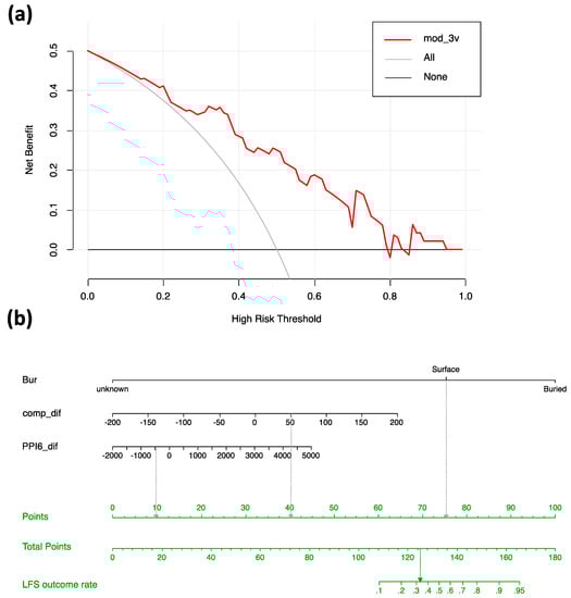 Potential for the most favored model. (a) Decision curve analysis of models for prediction of phenotypic outcome (LFS or HBC). The y-axis indicates the net benefit of using mod_3v model (red line). The thin gray line (All) shows net benefit values expected assuming all assessed variants are LFS. The darker gray line (None) shows net benefit values expected assuming no assessed variants are LFS. The net benefit for prediction of LFS variants is regarded as positive for probability values exceeding those for the “All” and “None” values. (b) The nomogram that facilitates manual estimation of the risk of LFS disease outcome using the mod_3v model. For the value of each explanatory variable the equivalent value on the “Points” scale is assessed. The sum of all Points values is then located on the “Total Points” scale (middle green row) so that the corresponding probability value can be read from the “LFS outcome rate” scale (upper green row). The dotted arrows show a hypothetical example for a surface residue with a comp_dif value of 50 and a PPI6_dif value of −500, for which the equivalent “Point” values (10, 40 and 75) summate to 125 (“Total Points”), giving a LFS outcome risk of slightly over 0.3.